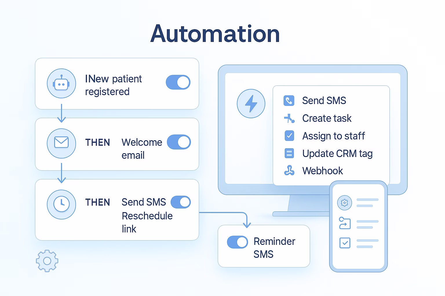 תקשורת אוטומטית בווטסאפ, SMS ומייל, תזכורות, תיאום תורים ומסרים מותאמים אישית.